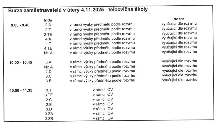 Burza zaměstnavatelů Posted by Dagmar Přibylová on 23.10.2025 4.11.2025 proběhne v tělocvičně školy. Rozpis tříd: