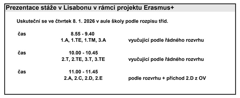 Prezentace stáže v Lisabonu Posted by Dagmar Přibylová on 7.1.20267.1.2026 ve čtvrtek 8.1. dle rozpisu: